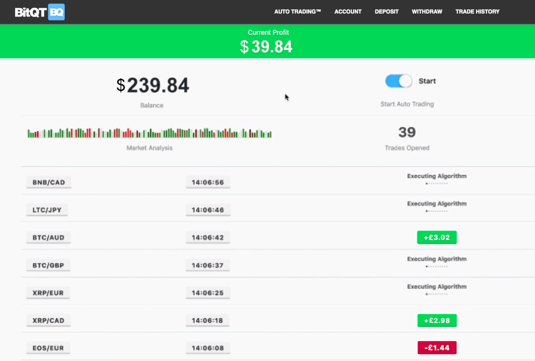 The official website of claims it can generate high profits for any user by executing a unique trading algorithm. This algorithm enables the user to automatically trade Bitcoin and other crypto currencies.